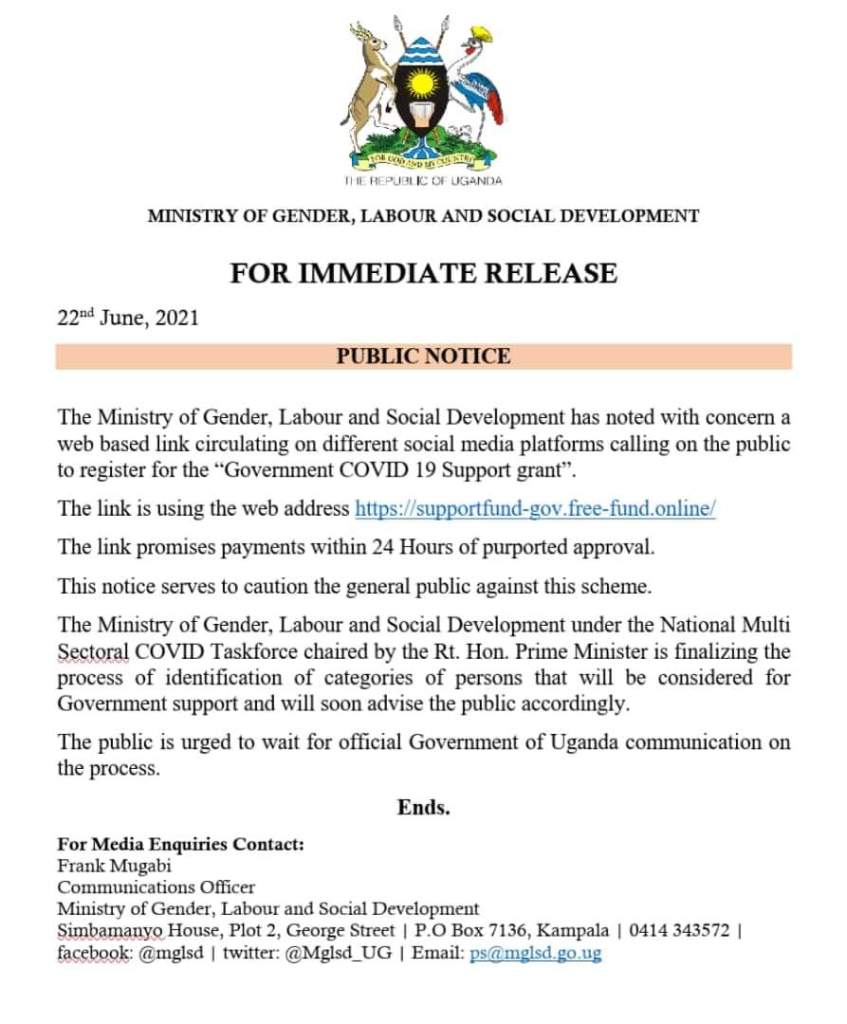 “This notice serves to caution the general public against that scheme. The Ministry of Gender under the national multi-sectoral Covid taskforce chaired by Rt Hon Prime Minister is finalizing the process of identification of categories of persons that will be considered for government support and will soon advise the public accordingly,” the statement said.
