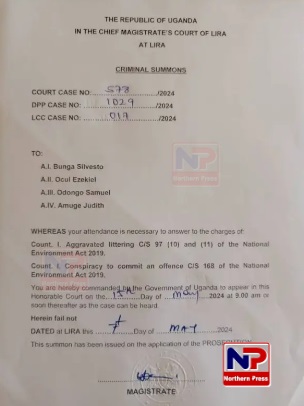 According to criminal summons, court case number 578/2024, Directorate of Public Prosecution case number 1029/2024 and Lira City Council case number 017/2024, the two suspects, Ezekiel Ocul and Samuel Odongo, Drug Shop proprietor Silvesto Bunga, and Judith Amuge, the registered nurse whose medical papers are being used to operate the Drug Shop have been commanded by the Government of Uganda to appear in court on May 15, 2024 at 9:00AM to answer the charges of; Aggravated littering C/S 97(10) and (11) of the National Environment Act 2019, and another count of Conspiracy to commit an offence C/S 168 of the National Environment Act 2019.
